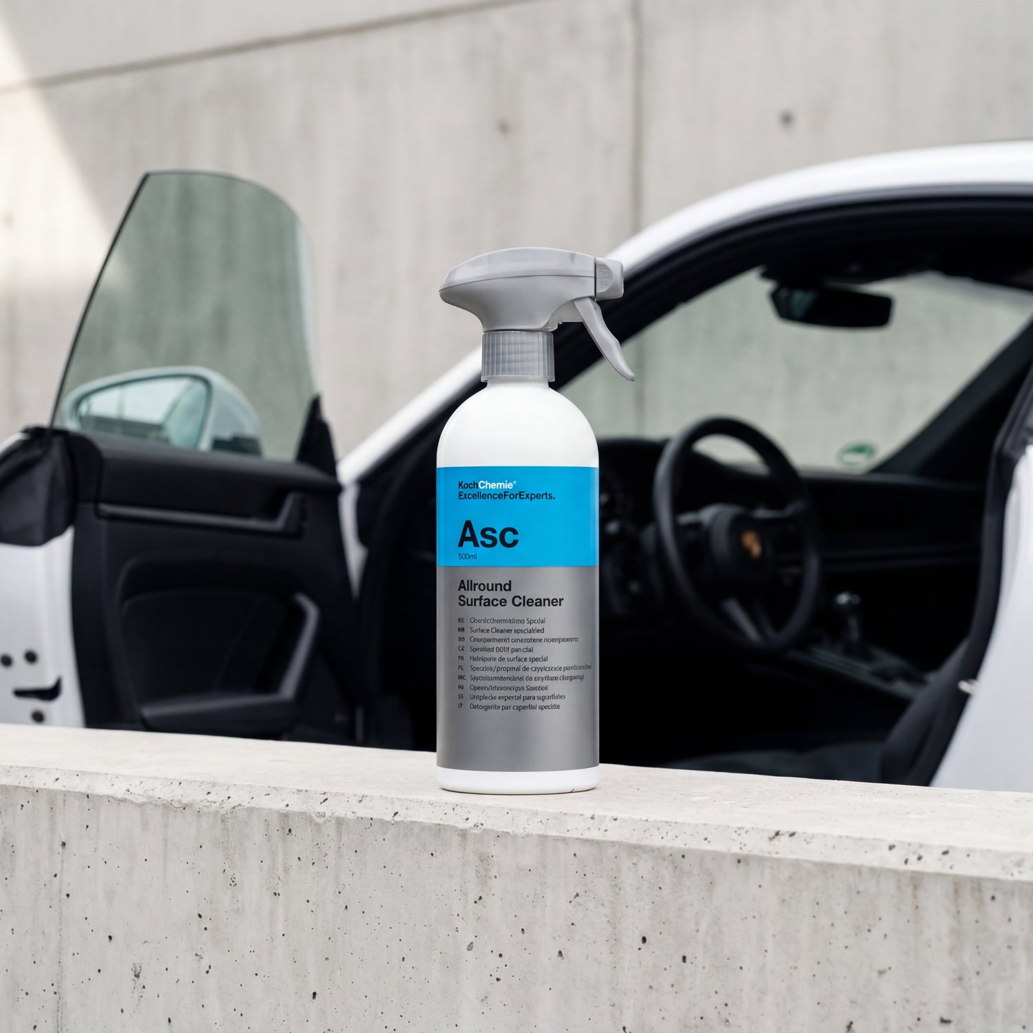 Koch-Chemie ASC 500 ml on concrete wall edge in front of black car interior