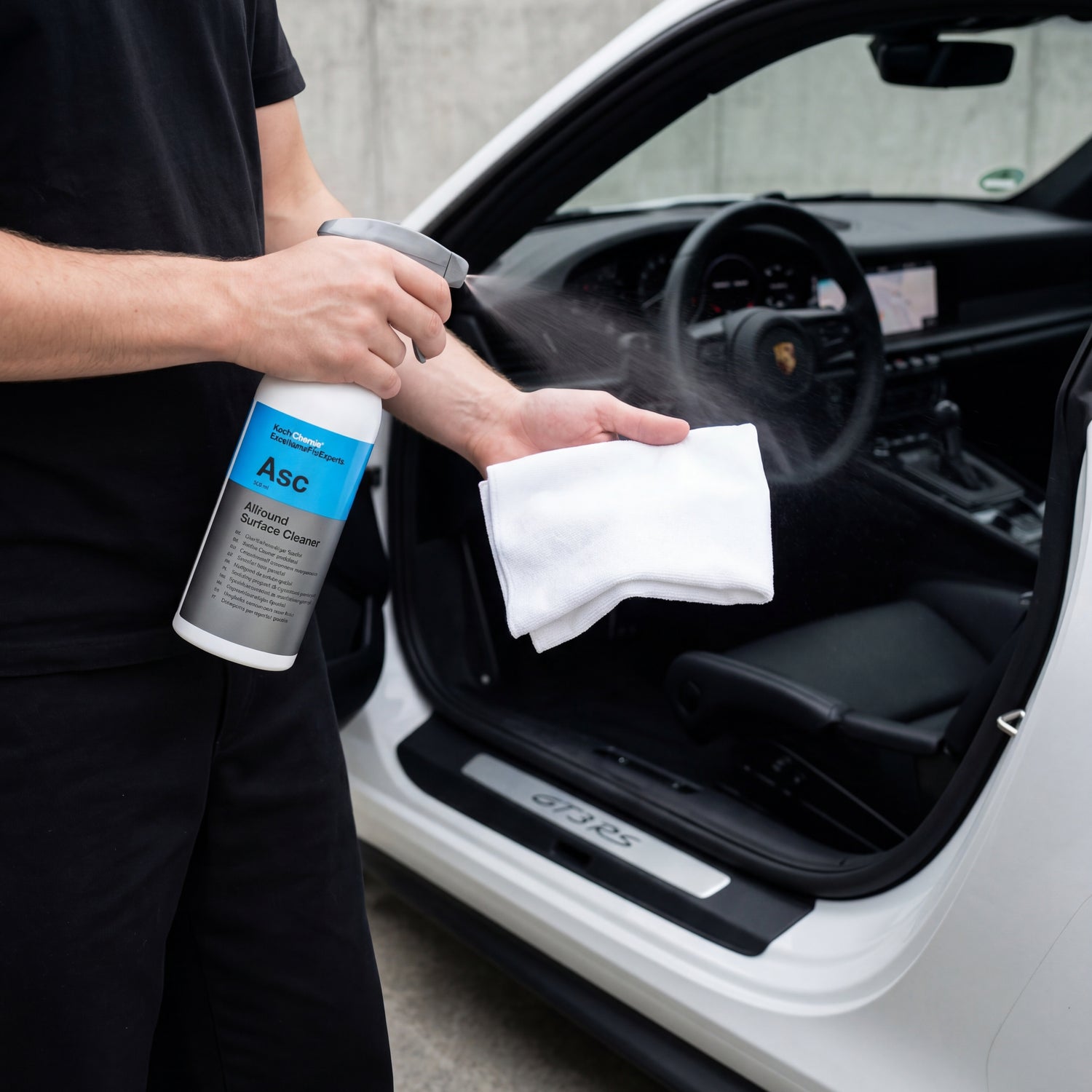 Notes: Never spray the headliner directly — the fabric must not get soaked, otherwise the adhesive underneath will loosen and the headliner will sag. On Alcantara, open-pore fabric upholstery, and microfiber seat covers, use a dilution of 1:5 to 1:10 and apply the cleaner via the cloth, not directly onto the material. After cleaning leather, follow up with a leather conditioner to maintain its re-greasing properties. For oily workshop surfaces, dried-on nicotine film, and yellowed door sills, the neutral ASC is not sufficient — here you should use the alkaline Koch-Chemie Green Star.