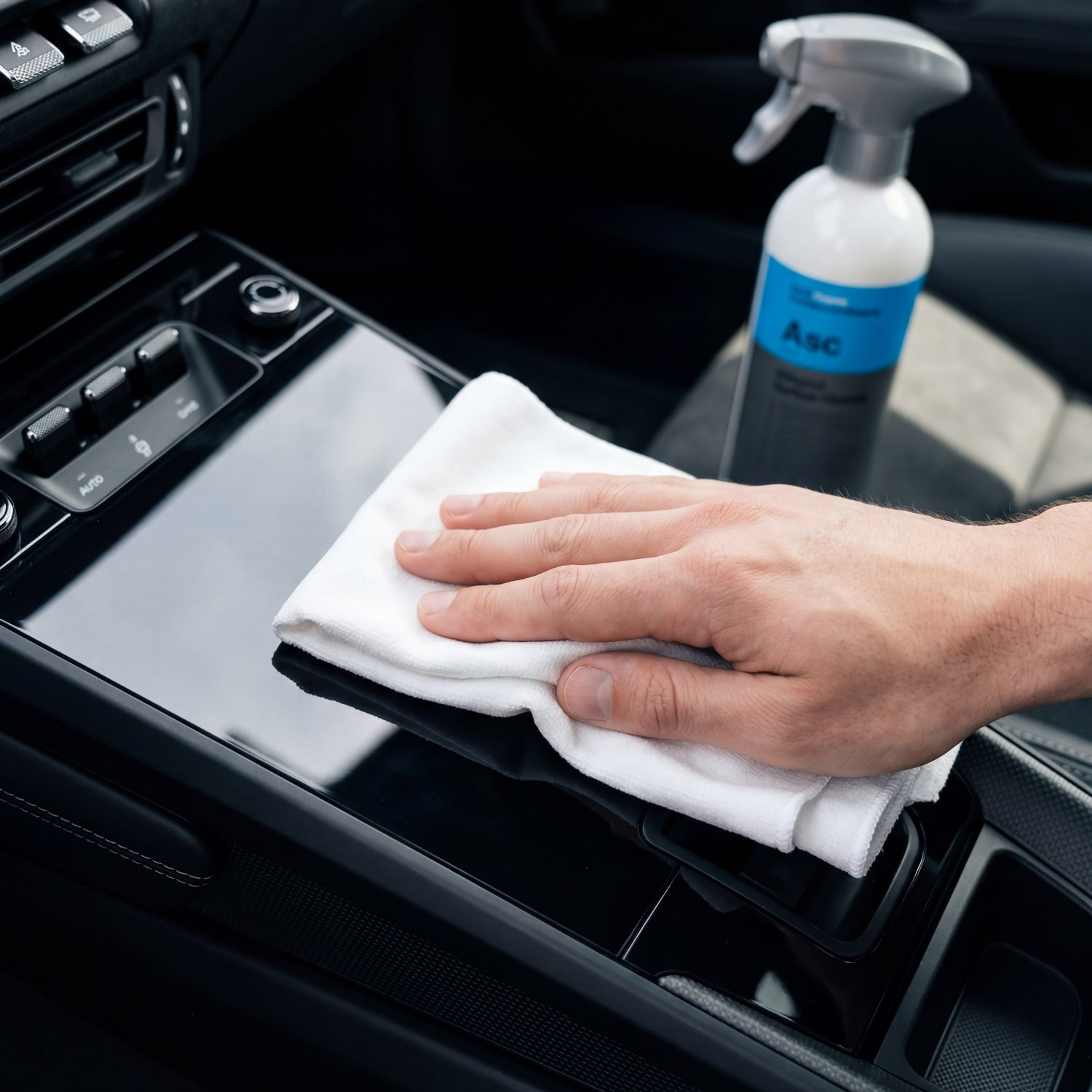 Always spray the ASC onto a clean microfiber cloth, not directly onto the surface — especially for displays, speedometer glass, and piano black trim. Otherwise, the spray mist will settle in gaps and run uncontrollably. Work in manageable sections so that the cloth doesn't dry out in between.