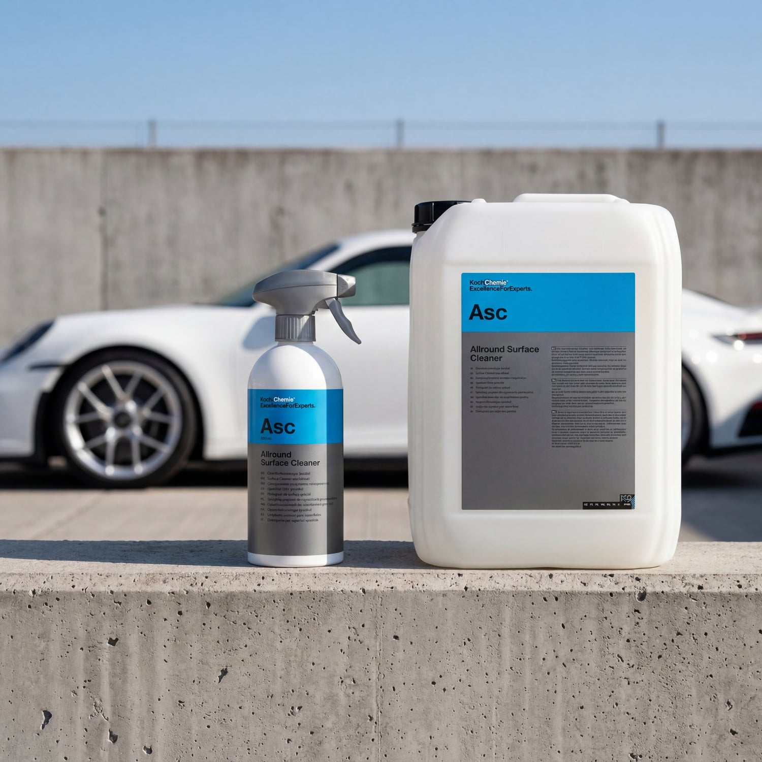 Koch-Chemie ASC 500 ml and 10 L variants lineup on concrete