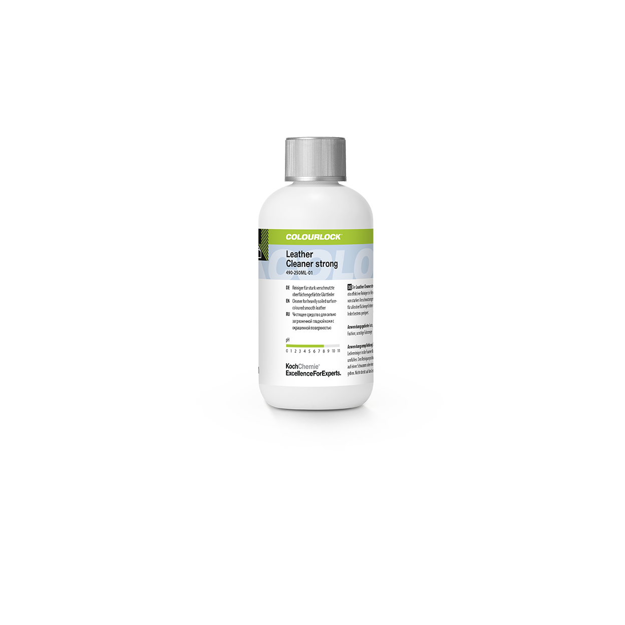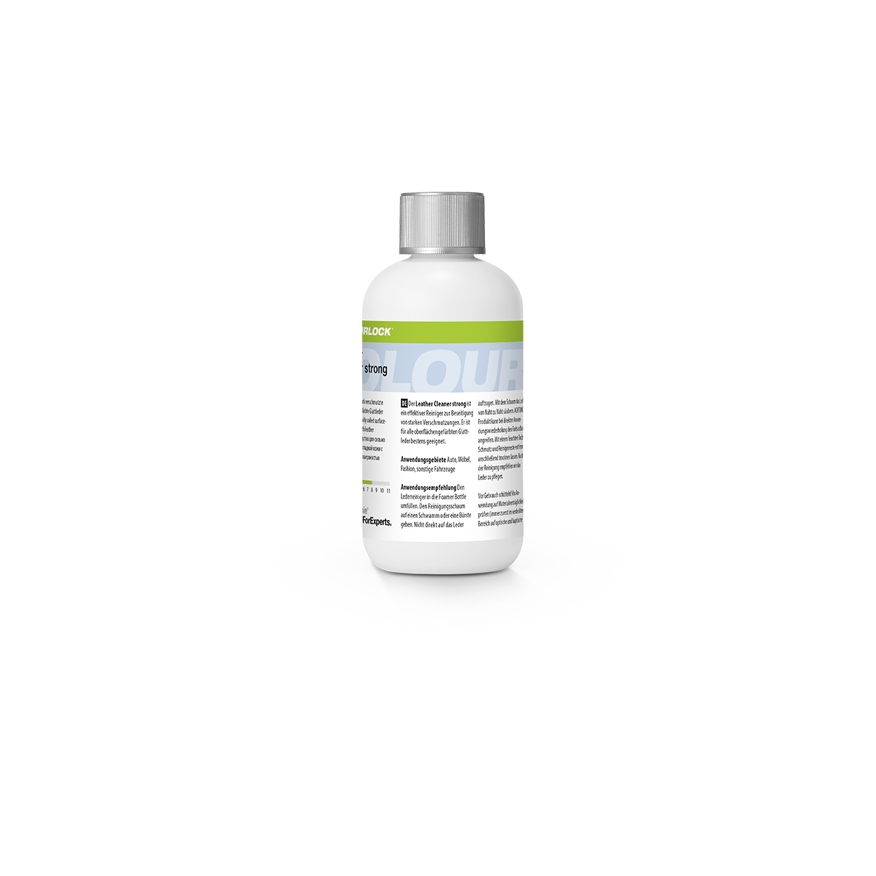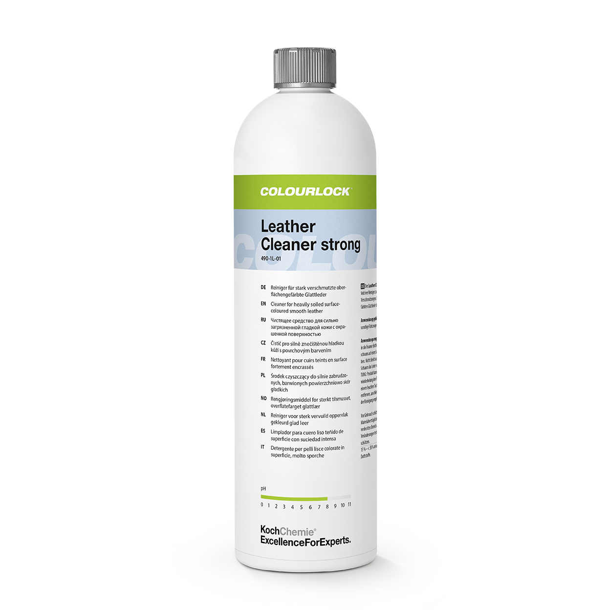What is COLOURLOCK Leather Cleaner Strong suitable for? — The cleaner thoroughly removes stubborn dirt, grease, abrasion, and deep-seated impurities from pigmented smooth leather, without drying out or attacking the surface.