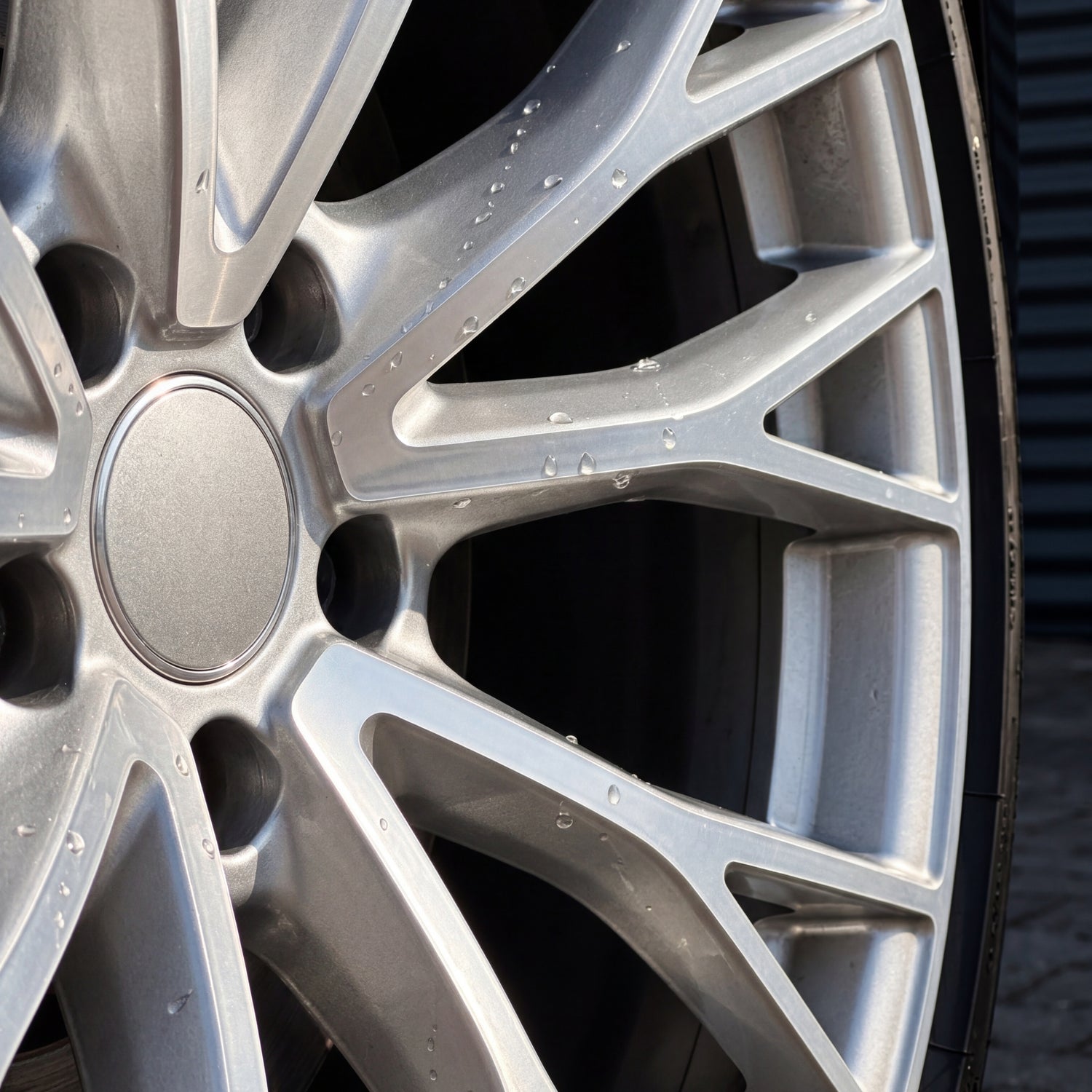The order in the wheel area is important. First, cover the tire sidewall or apply the dilution precisely — hydrochloric acid can bleach tire markings. Then treat the rim itself, always working in the same rotational position so that no area is overlooked. After rinsing, visually check and only apply a second pass if there is visible residual dirt — this is rarely necessary with correctly dosed initial application.