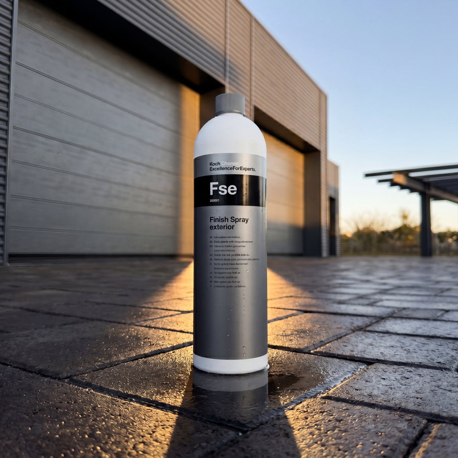 Koch-Chemie Finish Spray Exterior only works reliably on cool, dry surfaces. On hot sheet metal after direct sunlight, the spray dries too quickly and leaves residues instead of removing them. Park the vehicle in the shade beforehand and wait five minutes. If the surface is still noticeably warm to the touch, do not start yet.
