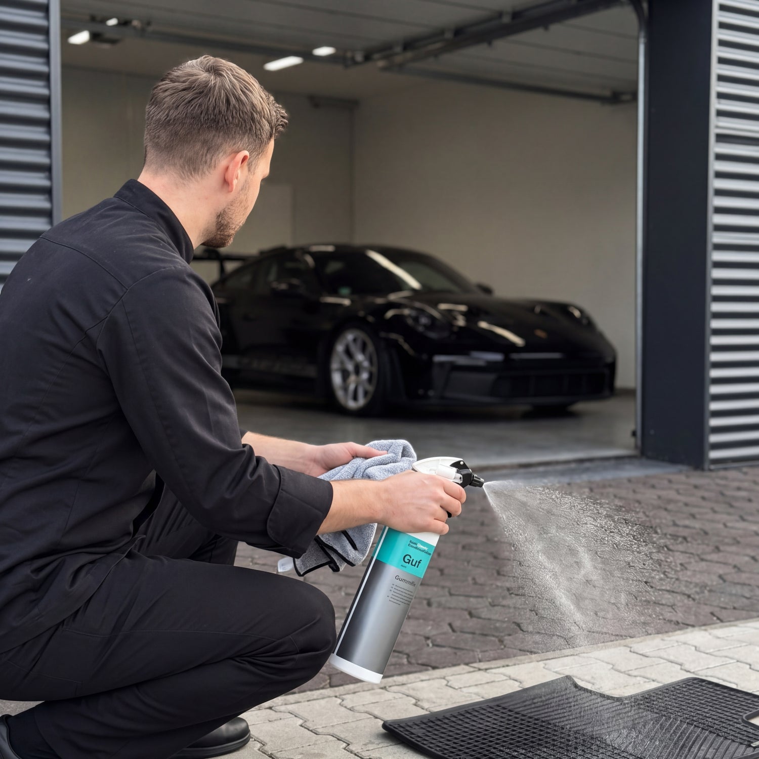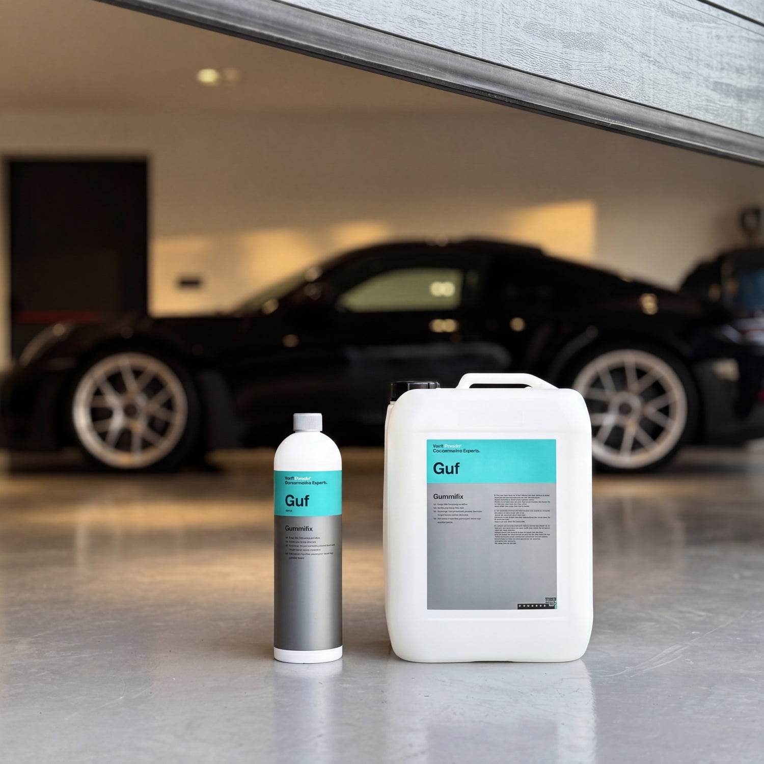 Gummifix—abbreviation Guf—is the matte, non-slip variant for floor mats and pedal rubbers. Koch-Chemie Rubber and Plastic Care Gkg produces a distinct high gloss and is intended for visible exterior parts such as bumper plastics or wheel arch covers—where gloss is desired. The Gkv is the third level with an additional vinyl component for boat covers, convertible tops, and vinyl flooring—more specialized, usually too much product and too expensive per application for everyday vehicles.