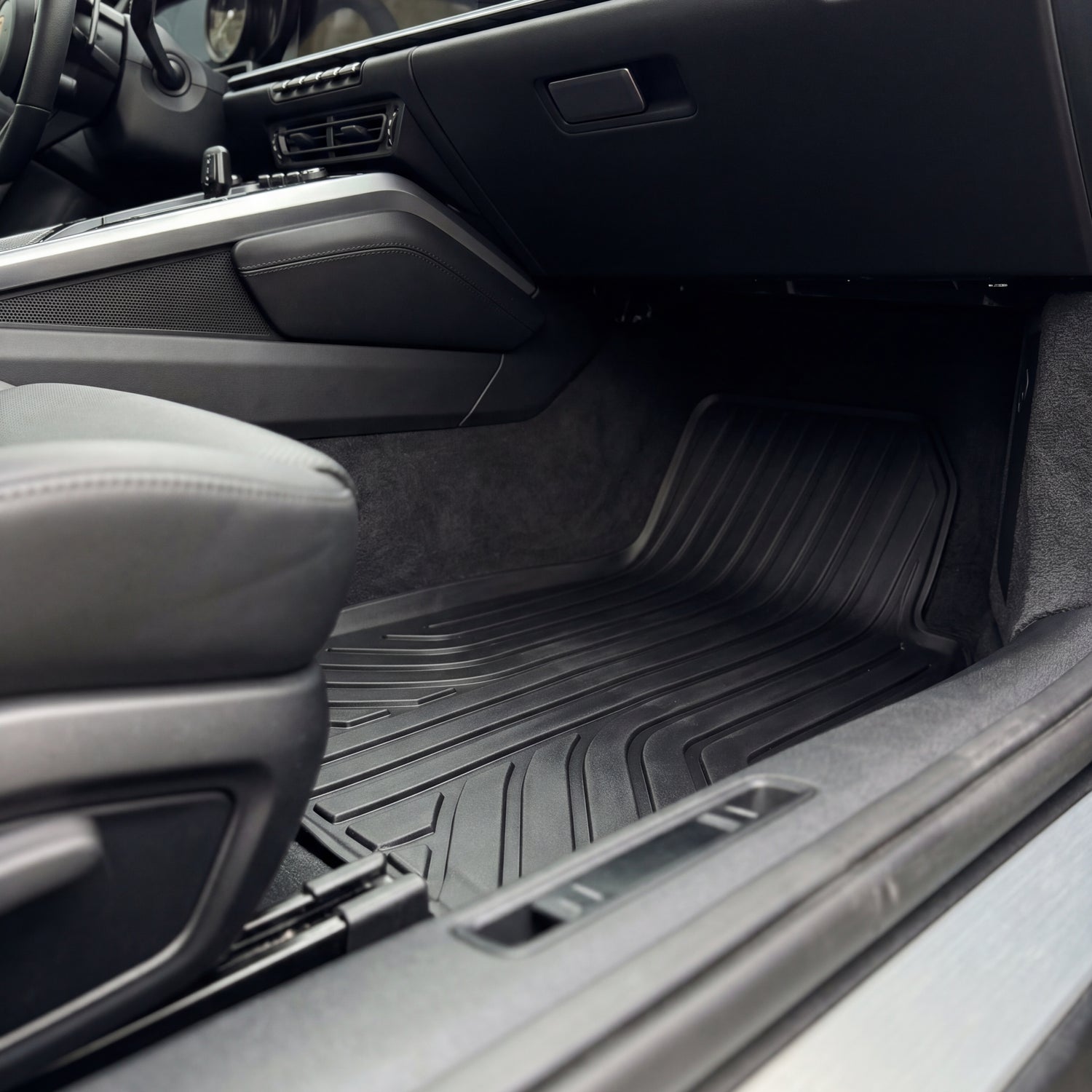 Remove the floor mats and rubber parts from the vehicle, shake them out, and thoroughly degrease them with an all-purpose cleaner or a plastic cleaner. Rinse with clear water and let them dry completely — no residual moisture, no damp mist in the tread grooves. Only then is the surface ready for treatment.