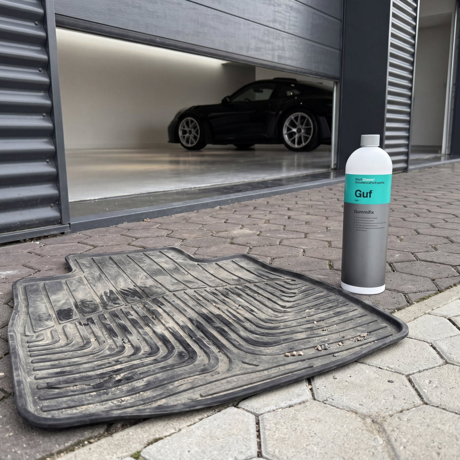 What is Koch-Chemie Gummifix? A silicone oil-free rubber and plastic care product for vehicle interiors that darkens floor mats, pedal rubbers, and cargo area linings to a satin finish without leaving a slippery surface. Not intended for glossy dashboards or permanently weathered exterior plastic parts.