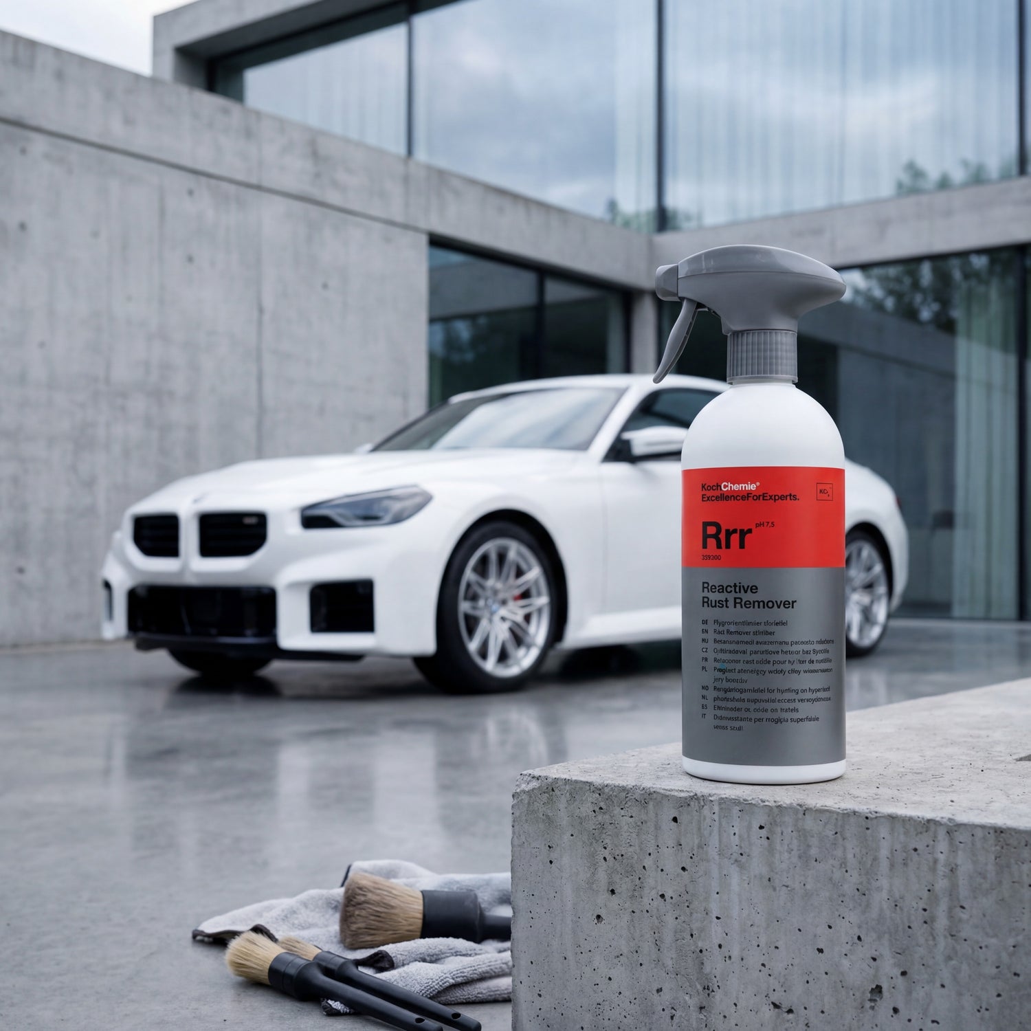 The Reactive Rust Remover "Rrr" from Koch-Chemie is a pH-neutral iron remover based on ammonium mercaptoacetate. It chemically dissolves iron particles from paint, glass, and rims — visibly indicated by a violet color change. At pH 7.5, it is acid-free and gentle on materials, suitable for use on all common surfaces.