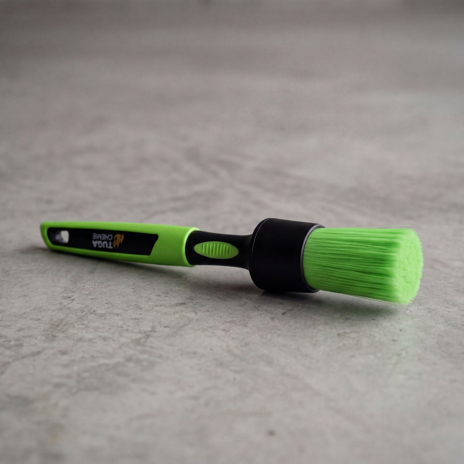 The Detailing Wheel Brush from TUGA Chemie is the precision tool in the wheel cleaning workflow. The green plastic handle with black silicone soft grip fits comfortably in the hand, and the black plastic ferrule connects the handle and bristles without metal parts — no point in the brush where acid or alkali could corrode. The green synthetic bristles are chemically resistant to pH values from 0 to 14 and at the same time soft enough to work directly on painted wheel surfaces, polished aluminum edges, and brushed stainless steel without leaving holograms or micro-scratches. This is the difference from cheap hardware store brushes with metal ferrules and hard nylon bristles, which rust after the third contact with a wheel cleaner and grind scratches into the paint.