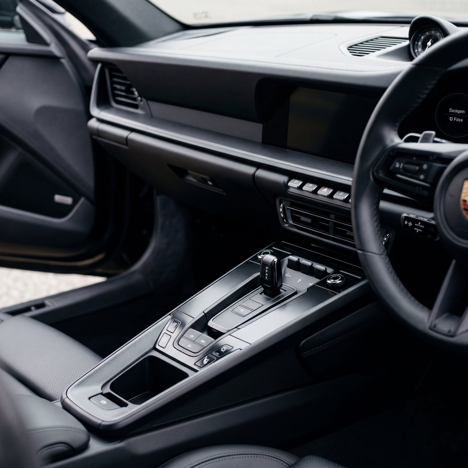 Freshly cleaned Porsche 911 cockpit with clean steering wheel, streak-free speedometer, and matte black dashboard