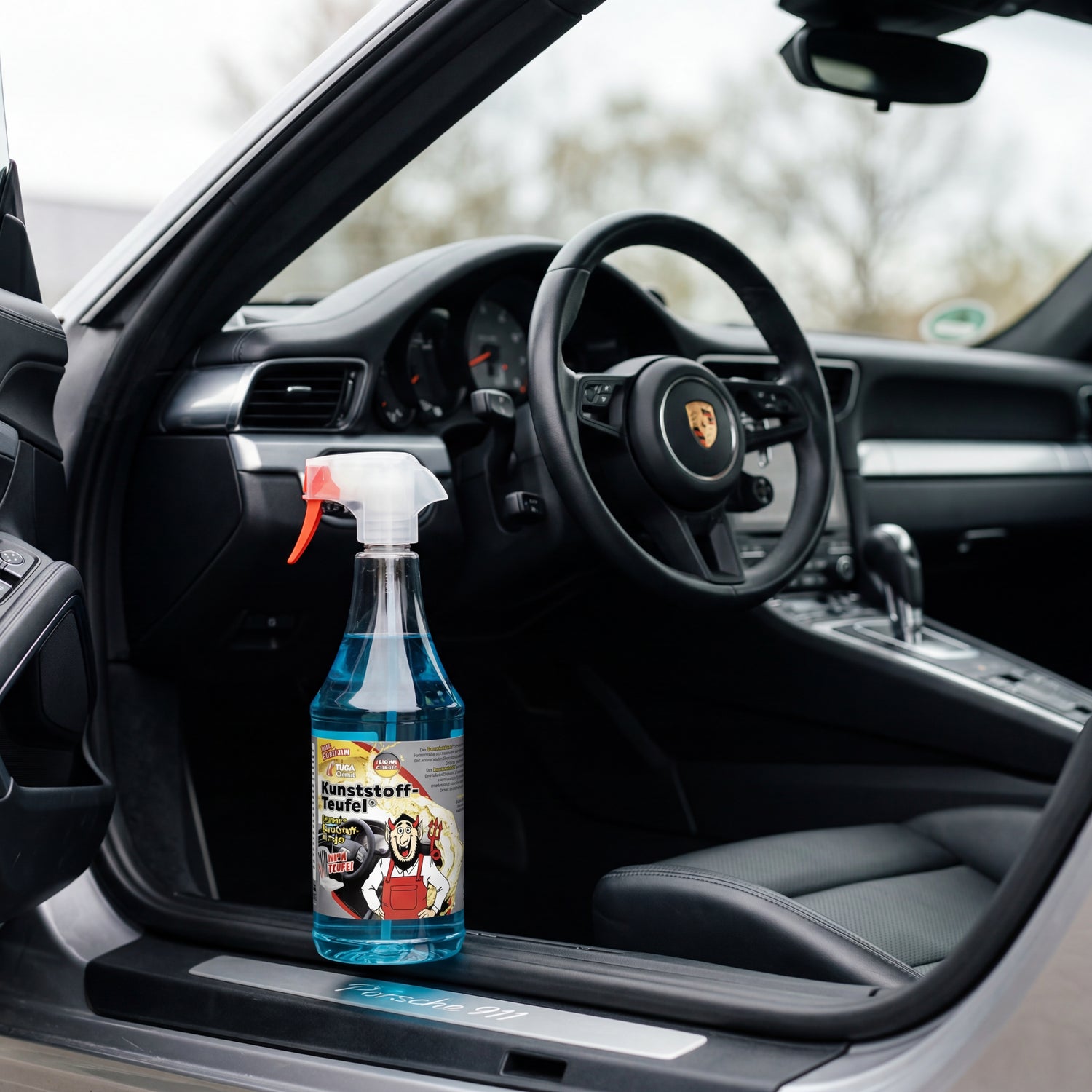 TUGA Chemie Kunststoff-Teufel 1L spray bottle with blue liquid and red trigger on the dashboard of a black Porsche 911