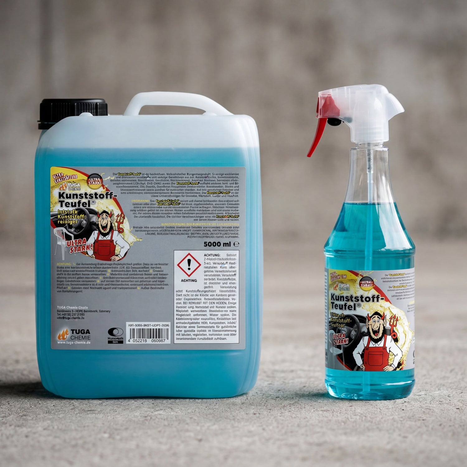 In TUGA Chemie's product range, the Kunststoff-Teufel is the interior all-rounder. It complements the Tugalin window cleaner for glass surfaces and the interior care section for the finish after cleaning. In the classic detailing workflow, it comes after vacuuming and before polishing the glass surfaces, so you have clean plastic surfaces before continuing with a fresh cloth. Anyone who completely cleans their company car quarterly will experience the biggest jump after the first treatment: the steering wheel, gear knob, and the areas around the door handle visibly shed their grayish-brown patina.