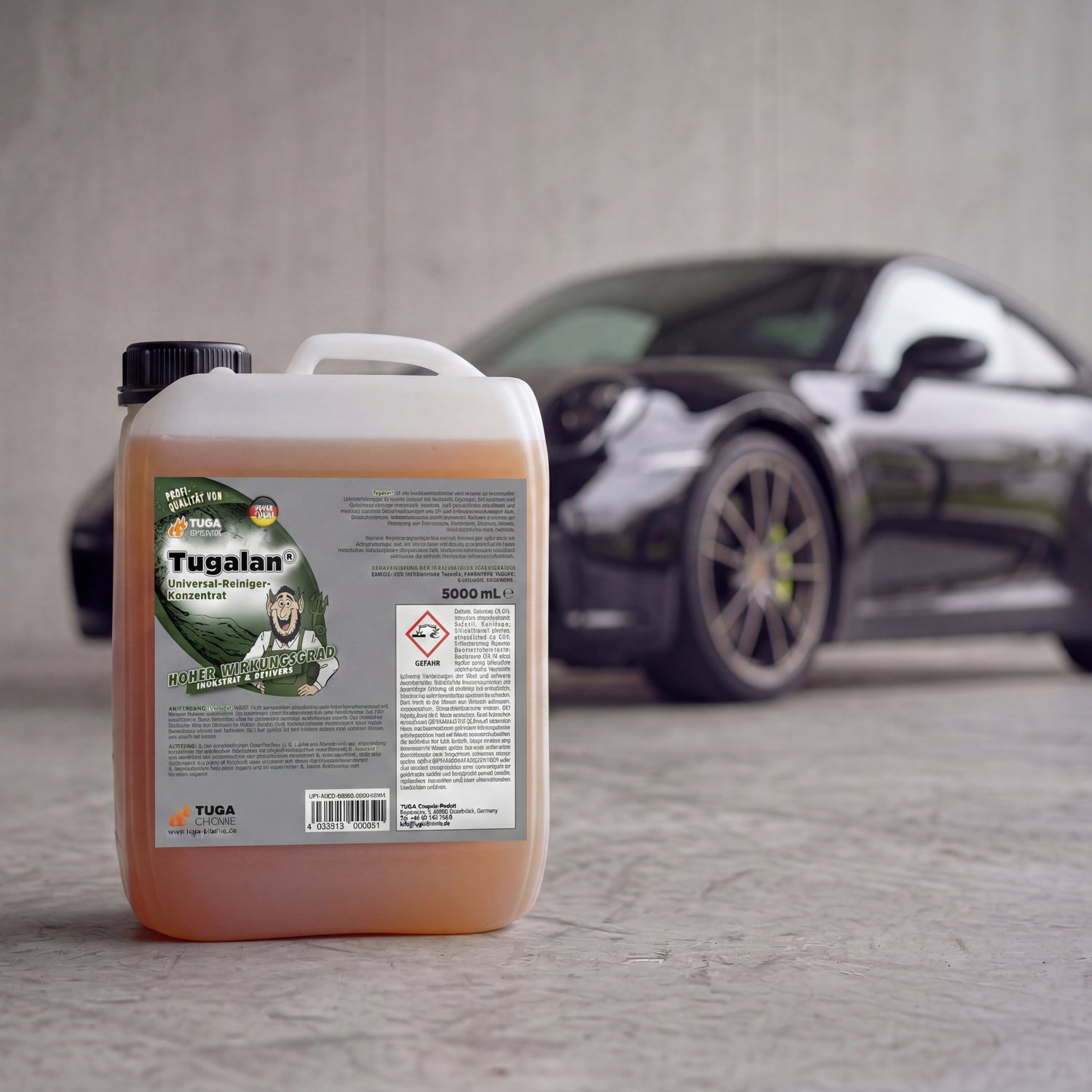 Tugalan is available exclusively as a 5-liter canister with a black handling cap. This is the only sensible container size, because the product only develops its cost-efficiency above a certain consumption volume. For occasional home use, a concentrate is the wrong choice; a ready-to-use all-purpose cleaner is better for everyday use there. For workshops, fleet operators, car dealerships, cleaning companies, motorhome rental companies, and anyone who details multiple vehicles per week, Tugalan is the mathematically most economical option. From a 5-liter canister, with an average 1:20 dilution, about 100 liters of working solution are produced; at 1:40, even 200 liters. With proper use and a sealed container, the canister is stable for at least 24 months. This makes Tugalan a workshop product with a clear statement: unspectacular in appearance, reliable in effect, honest in consumption ratio. A classic for everyone who doesn't need ten special bottles on the shelf, but a basic cleaner they can rely on.