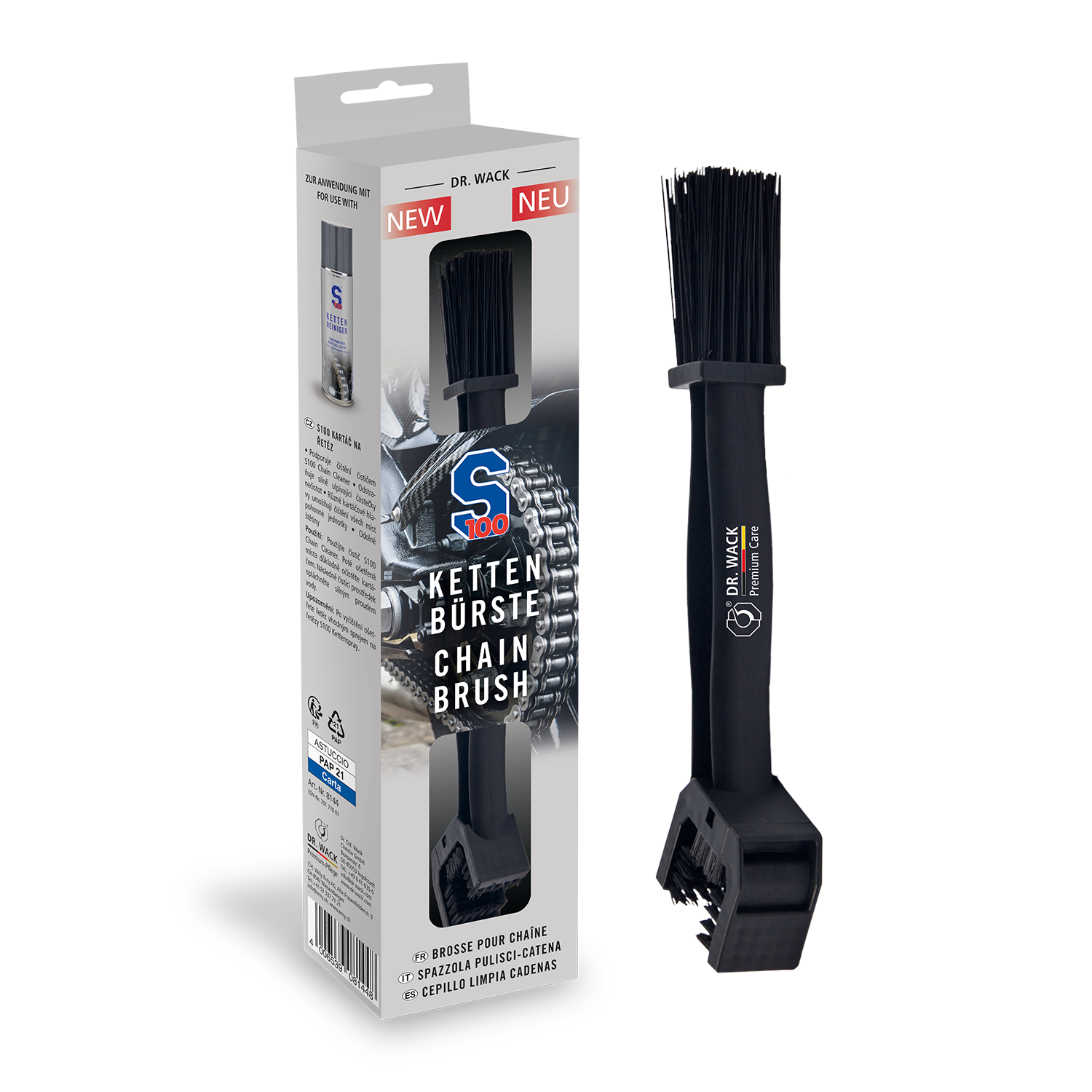 Effektive Reinigungsbürste für verschmutzte Motorradketten mit der Dr. Wack "S100" Kettenbürste für Motorrad