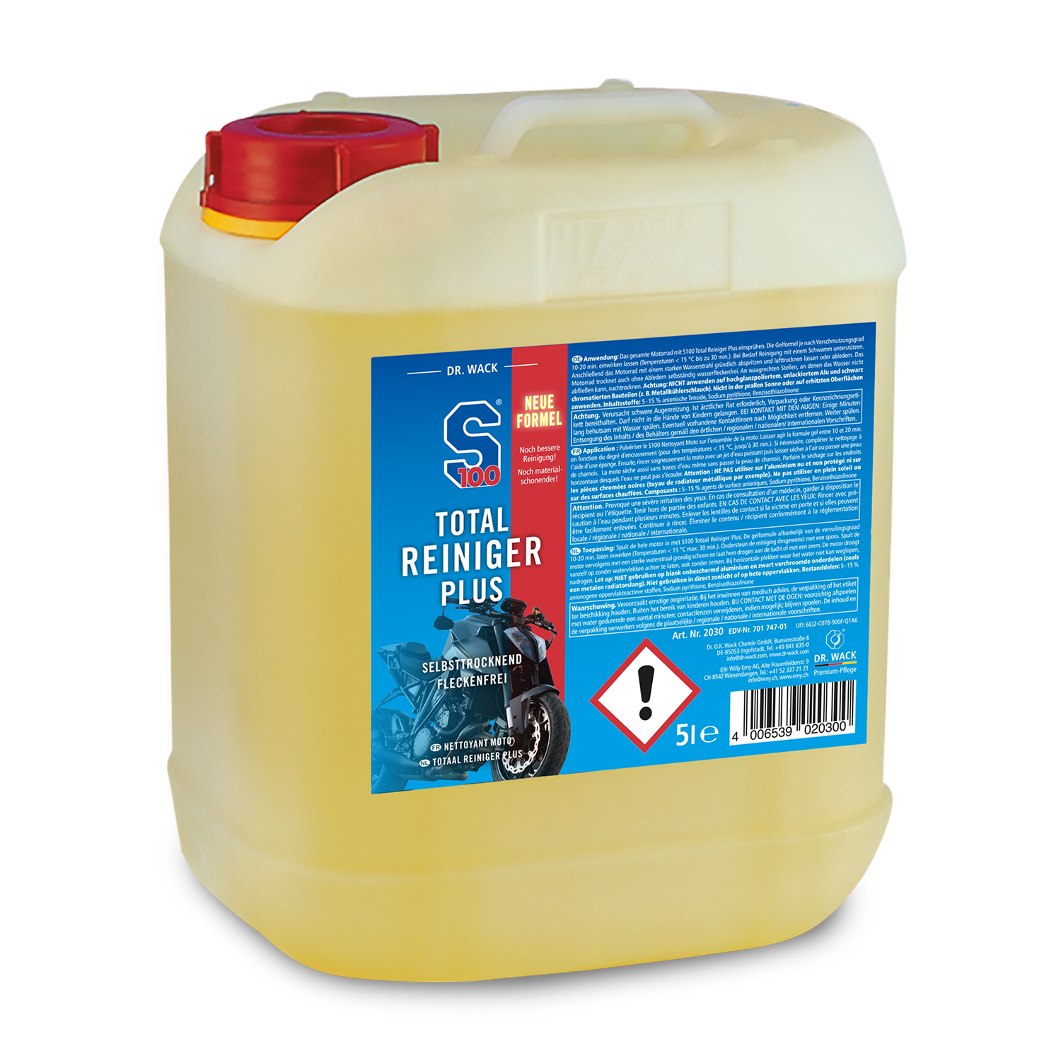 Der Dr. Wack S100 Total Reiniger Plus ist ein innovativer Motorradreiniger mit Gel-Formel, der selbst hartnäckige Verschmutzungen wie Insektenreste, Öl und Fett mühelos entfernt. Dank seiner neuen Formel trocknet er wasserfleckenfrei ohne Abledern und ist dabei besonders schonend zu empfindlichen Oberflächen wie unbeschichteten Pulverlacken. Die Anwendung ist einfach: aufsprühen, einwirken lassen und abspülen – ganz ohne Nachpolieren.