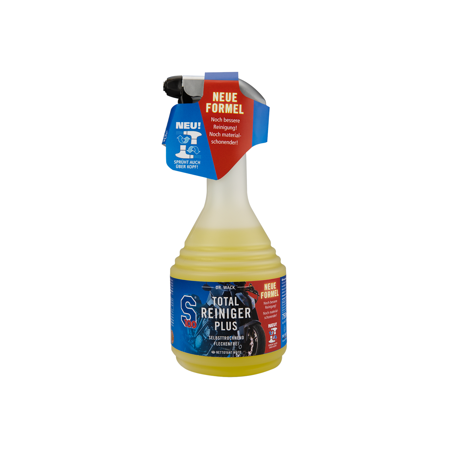 Der S100 Total Reiniger Plus ist jetzt auch mit einer praktischen Kopfüber-Sprühfunktion ausgestattet. So erreichst du mühelos schwer zugängliche Stellen an deinem Motorrad. Die Anwendung ist somit noch einfacher und effektiver – für eine rundum saubere Maschine.