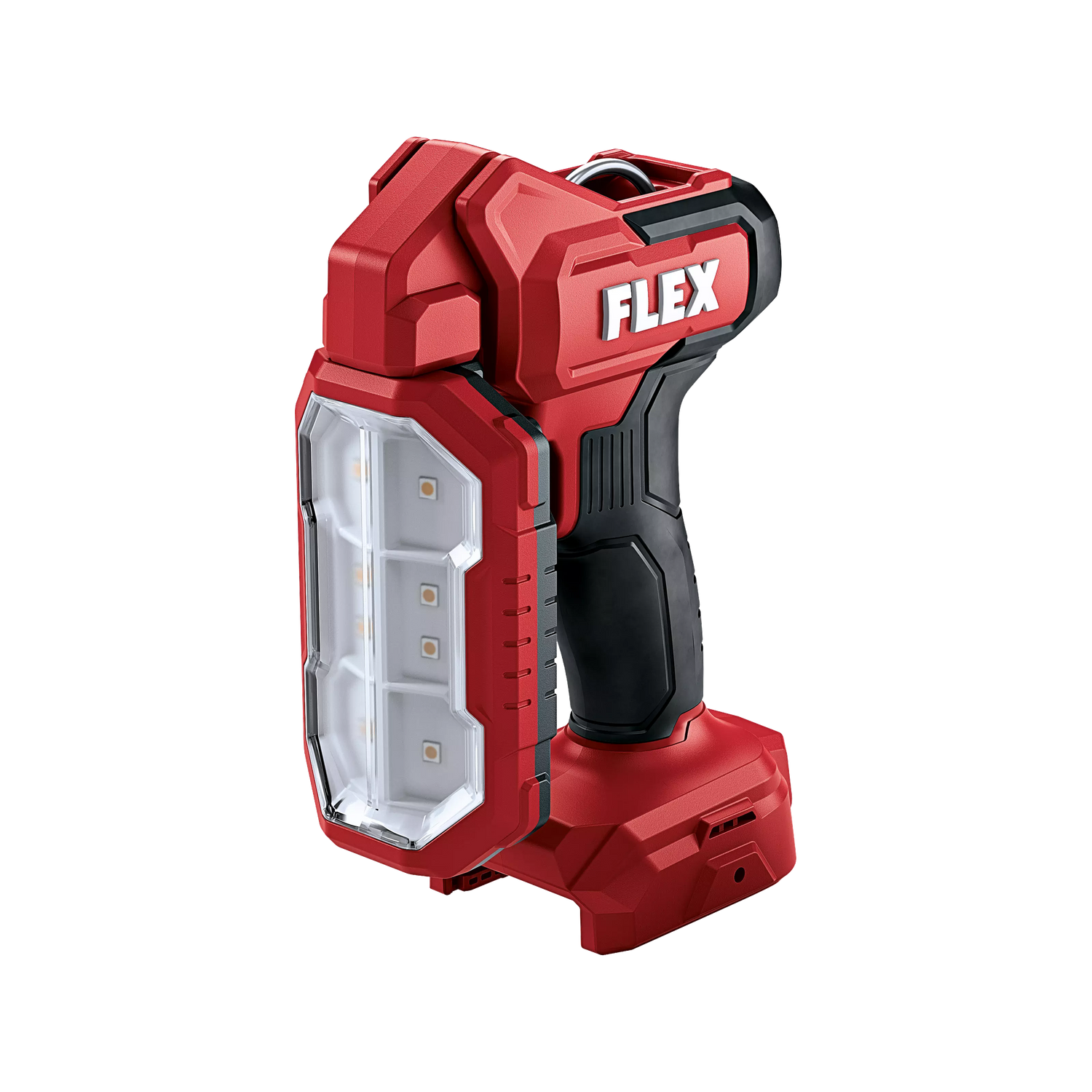 Kabelloser 18V LED-Strahler mit 1.000 Lumen in 3 Helligkeitsstufen, 180°+270° Schwenkkopf, integrierten Magneten und Metallbügel. Kompatibel mit allen FLEX 18V Akkupacks. 4000K Farbtemperatur, 8 LEDs, 0,6 kg ohne Akku. Inkl. Gürtelclip.